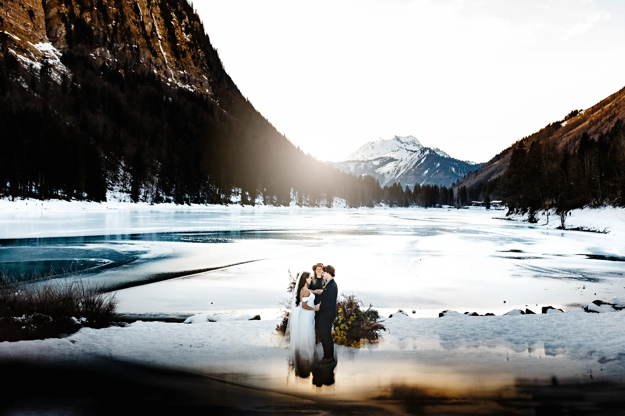 Just a short drive away is Lac de Montriond, one of the most magical and cinematic places for a winter ceremony in the Alps. The lake often freezes in colder months, surrounded by forests and mountains blanketed in snow. It’s quiet, majestic, and absolutely unforgettable.